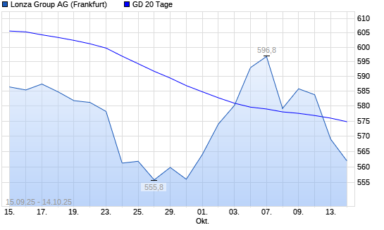 Mit dem Rücksetzer auf 569,00 EUR hat die Lonza Group-Aktie am 13.10.2025 die 20-Tage-Linie nach unten gekreuzt.Die Lonza Group-Aktie befindet sich seit dem 10.09.2025 im langfristigen ...weiterlesen