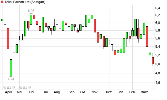 Mit dem Rücksetzer auf 4,94 EUR hat die Tokai Carbon-Aktie (ISIN JP3560800009) am 19.03.2026 ein neues 6-Monats-Tief erreicht und damit den Kurs vom 17.03.2026 eingestellt.Die ...weiterlesen