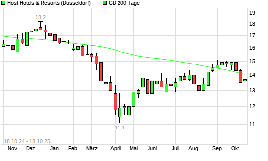 Mit dem Rücksetzer auf 13,50 EUR hat die Host Hotels & Resorts-Aktie am 17.10.2025 die 200-Tage-Linie nach unten gekreuzt.Die Host Hotels & Resorts-Aktie befand sich seit dem 16.10.2025 ...weiterlesen