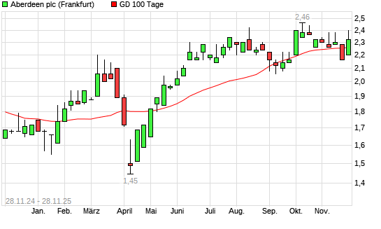 Mit dem Anstieg auf 2,40 EUR hat die Standard Life Aberdeen-Aktie am 27.11.2025 die 100-Tage-Linie nach oben gekreuzt.Die Standard Life Aberdeen-Aktie befindet sich seit dem 02.05.2025 im langfristigen ...weiterlesen