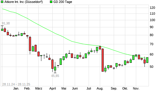 Mit dem Anstieg auf 57,24 EUR hat die Atkore-Aktie am 27.11.2025 die 200-Tage-Linie nach oben gekreuzt.Die Atkore-Aktie befand sich seit dem 21.11.2025 im langfristigen Abwärtstrend und hat ...weiterlesen