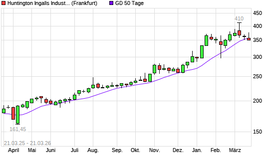 Mit dem Rücksetzer auf 351,20 EUR hat die Huntington Ingalls-Aktie am 20.03.2026 die 50-Tage-Linie nach unten gekreuzt.Die Huntington Ingalls-Aktie befindet sich seit dem ...weiterlesen