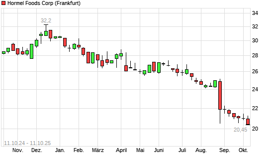 Mit dem Rücksetzer auf 20,45 EUR hat die Hormel Foods-Aktie (ISIN US4404521001) am 10.10.2025 ein neues 10-Jahres-Tief erreicht und damit den Kurs vom 23.09.2025 eingestellt.Die Hormel ...weiterlesen