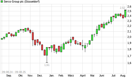 Mit dem Anstieg auf 2,52 EUR hat die Serco Group-Aktie (ISIN GB0007973794) am 08.08.2025 ein neues 10-Jahres-Hoch erreicht und damit den Kurs vom 15.07.2025 eingestellt.Die Serco Group-Aktie ...weiterlesen