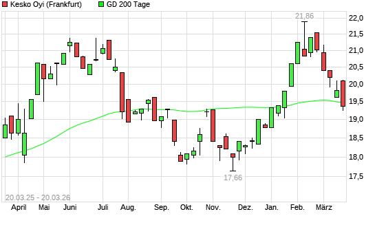 Mit dem Rücksetzer auf 19,26 EUR hat die Kesko B-Aktie am 19.03.2026 die 200-Tage-Linie nach unten gekreuzt.Die Kesko B-Aktie befand sich seit dem 15.01.2026 im ...weiterlesen