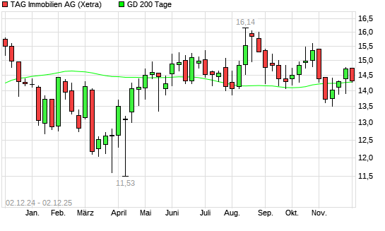 Mit dem Rücksetzer auf 13,93 EUR hat die TAG Immobilien-Aktie am 01.12.2025 die 200-Tage-Linie nach unten gekreuzt.Die TAG Immobilien-Aktie befand sich seit dem 26.11.2025 im langfristigen ...weiterlesen