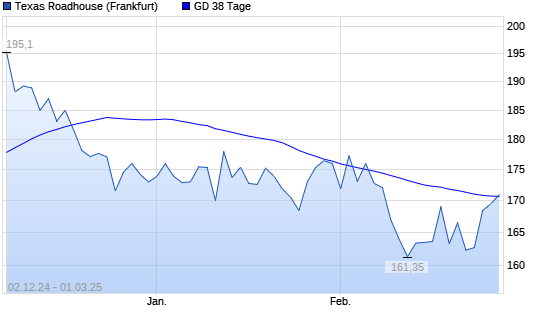Mit dem Anstieg auf 170,35 EUR hat die Texas Roadhouse-Aktie am 28.02.2025 die 38-Tage-Linie nach oben gekreuzt.Die Texas Roadhouse-Aktie befindet sich seit dem 26.02.2025 im langfristigen Aufwärtstrend ...weiterlesen