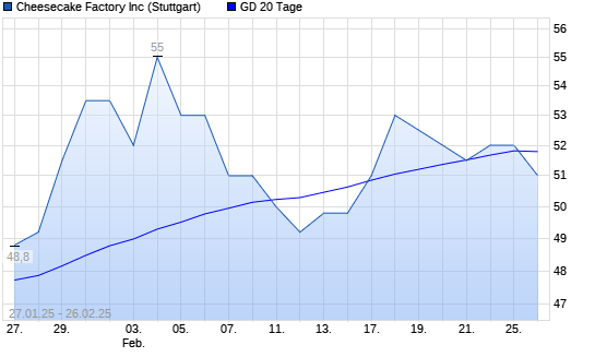 Mit dem Rücksetzer auf 50,50 EUR hat die The Cheesecake Factory-Aktie am 25.02.2025 die 20-Tage-Linie nach unten gekreuzt.Die The Cheesecake Factory-Aktie befindet sich seit dem 16.09.2024 ...weiterlesen