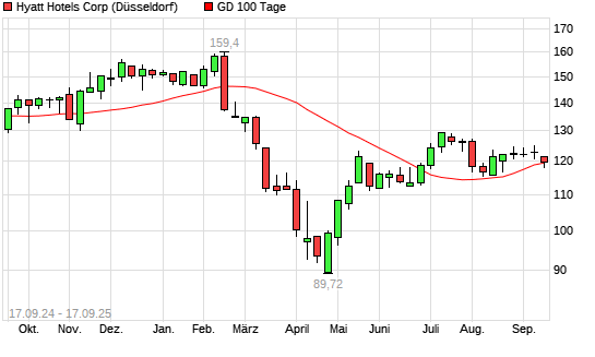 Mit dem Rücksetzer auf 118,85 EUR hat die Hyatt Hotels A-Aktie am 16.09.2025 die 100-Tage-Linie nach unten gekreuzt.Die Hyatt Hotels A-Aktie befindet sich seit dem 14.02.2025 im langfristigen ...weiterlesen