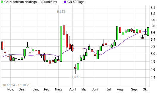 Mit dem Anstieg auf 5,80 EUR hat die CK Hutchison Holdings-Aktie am 09.10.2025 die 50-Tage-Linie nach oben gekreuzt.Die CK Hutchison Holdings-Aktie befindet sich seit dem 03.06.2025 im langfristigen ...weiterlesen