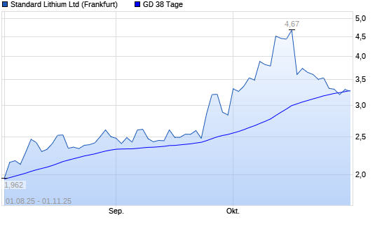 Mit dem Rücksetzer auf 3,27 EUR hat die Standard Lithium-Aktie am 31.10.2025 die 38-Tage-Linie nach unten gekreuzt.Die Standard Lithium-Aktie befindet sich seit dem 06.06.2025 im langfristigen ...weiterlesen
