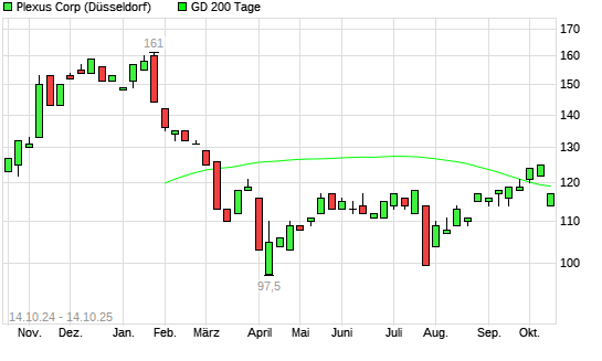 Mit dem Rücksetzer auf 117,00 EUR hat die Plexus-Aktie am 13.10.2025 die 200-Tage-Linie nach unten gekreuzt.Die Plexus-Aktie befand sich seit dem 29.09.2025 im langfristigen Aufwärtstrend ...weiterlesen