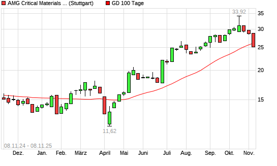Mit dem Rücksetzer auf 25,04 EUR hat die AMG Advanced Metallurgical Group-Aktie am 07.11.2025 die 100-Tage-Linie nach unten gekreuzt.Die AMG Advanced Metallurgical Group-Aktie befindet ...weiterlesen