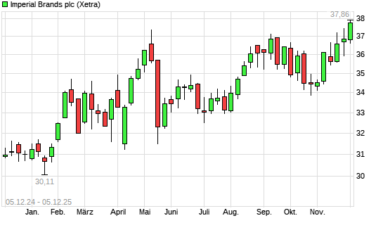 Mit dem Anstieg auf 37,72 EUR hat die Imperial Brands-Aktie (ISIN GB0004544929) am 04.12.2025 ein neues 5-Jahres-Hoch erreicht und damit den Kurs vom 07.05.2025 eingestellt.Die Imperial Brands-Aktie ...weiterlesen