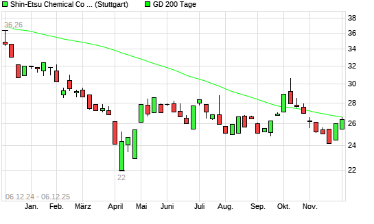 Mit dem Rücksetzer auf 26,42 EUR hat die Shin-Etsu Chemical-Aktie am 05.12.2025 die 200-Tage-Linie nach unten gekreuzt.Die Shin-Etsu Chemical-Aktie befand sich seit dem 04.12.2025 im langfristigen ...weiterlesen