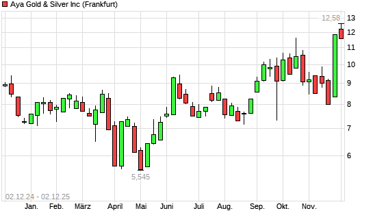 Mit dem Anstieg auf 11,96 EUR hat die Aya Gold & Silver-Aktie (ISIN CA05466C1095) am 01.12.2025 ein neues 12-Monats-Hoch erreicht und damit den Kurs vom 28.11.2025 eingestellt.Die Aya Gold & ...weiterlesen