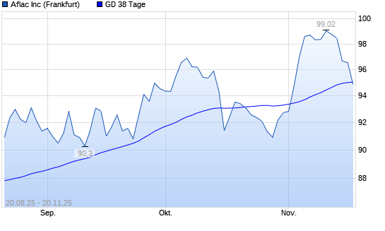 Mit dem Rücksetzer auf 94,88 EUR hat die Aflac-Aktie am 19.11.2025 die 38-Tage-Linie nach unten gekreuzt.Die Aflac-Aktie befindet sich seit dem 04.11.2025 im langfristigen Aufwärtstrend ...weiterlesen