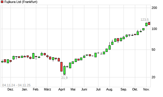 Mit dem Anstieg auf 123,50 EUR hat die Fujikura-Aktie (ISIN JP3811000003) am 03.11.2025 ein neues All-Time-High erreicht und damit den Kurs vom 31.10.2025 eingestellt.Die Fujikura-Aktie befindet ...weiterlesen