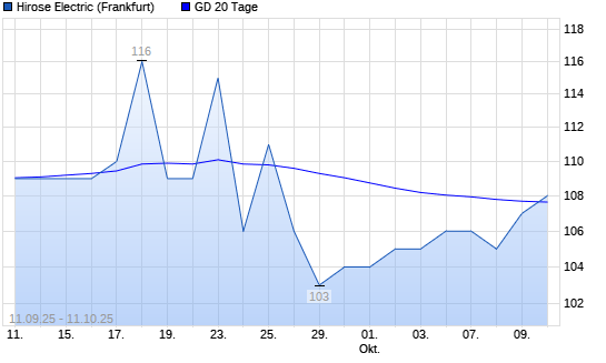 Mit dem Anstieg auf 108,00 EUR hat die Hirose Electric-Aktie am 10.10.2025 die 20-Tage-Linie nach oben gekreuzt.Die Hirose Electric-Aktie befindet sich seit dem 09.10.2025 im langfristigen Aufwärtstrend ...weiterlesen