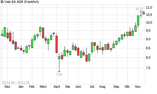 Mit dem Anstieg auf 10,75 EUR hat die Vale ADR-Aktie (ISIN US91912E1055) am 12.11.2025 ein neues 12-Monats-Hoch erreicht und damit den Kurs vom 05.11.2025 eingestellt.Die Vale ADR-Aktie befindet ...weiterlesen