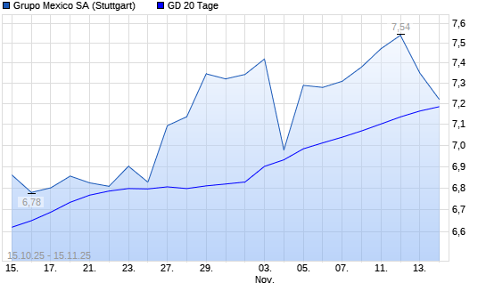Mit dem Rücksetzer auf 7,23 EUR hat die Grupo Mexico-Aktie am 14.11.2025 die 20-Tage-Linie nach unten gekreuzt.Die Grupo Mexico-Aktie befindet sich seit dem 25.06.2025 im langfristigen ...weiterlesen