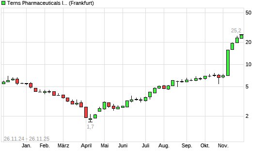 Mit dem Anstieg auf 25,20 EUR hat die Terns Pharmaceuticals-Aktie (ISIN US8808811074) am 25.11.2025 ein neues All-Time-High erreicht und damit den Kurs vom 24.11.2025 eingestellt.Die Terns Pharmaceuticals-Aktie ...weiterlesen