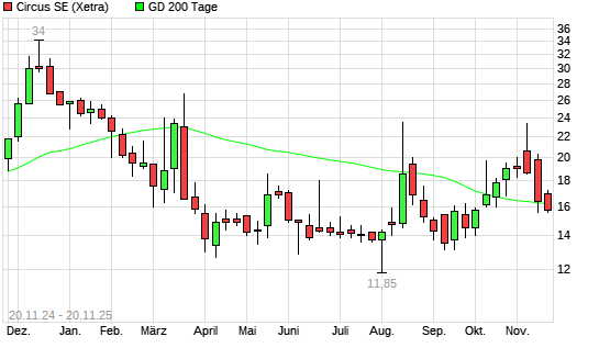 Mit dem Rücksetzer auf 15,80 EUR hat die Circus-Aktie am 19.11.2025 die 200-Tage-Linie nach unten gekreuzt.Die Circus-Aktie befand sich seit dem 07.10.2025 im langfristigen Aufwärtstrend ...weiterlesen