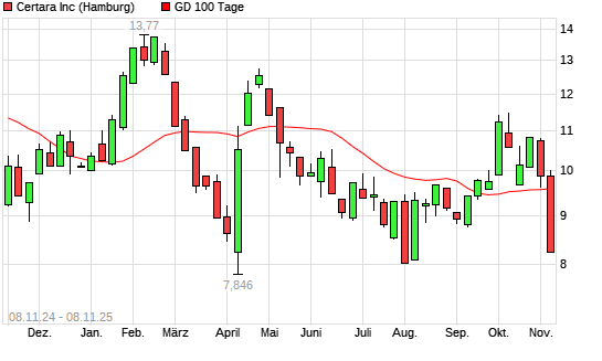 Mit dem Rücksetzer auf 8,23 EUR hat die Certara-Aktie am 07.11.2025 die 100-Tage-Linie nach unten gekreuzt.Die Certara-Aktie befindet sich seit dem 29.10.2025 im langfristigen Abwärtstrend ...weiterlesen
