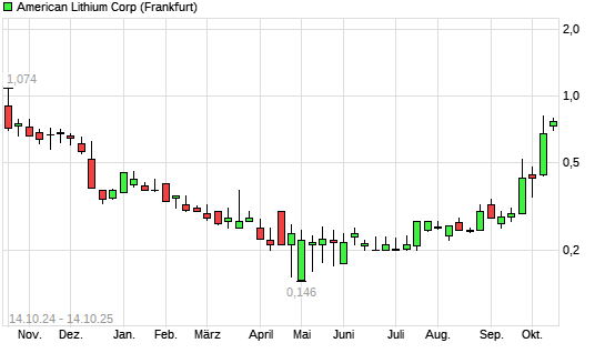 Mit dem Anstieg auf 0,79 EUR hat die American Lithium-Aktie (ISIN CA0272592092) am 13.10.2025 ein neues 6-Monats-Hoch erreicht und damit den Kurs vom 09.10.2025 eingestellt.Die American Lithium-Aktie ...weiterlesen