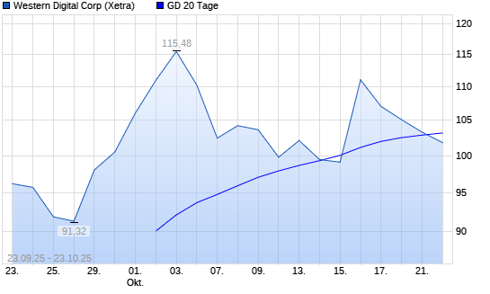 Mit dem Rücksetzer auf 101,00 EUR hat die Western Digital-Aktie am 22.10.2025 die 20-Tage-Linie nach unten gekreuzt.Die Western Digital-Aktie befindet sich seit dem 20.05.2025 im langfristigen ...weiterlesen