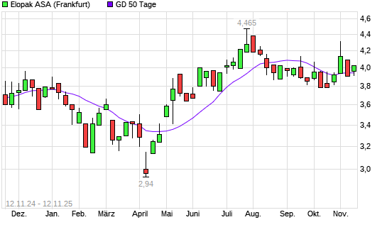 Mit dem Rücksetzer auf 3,91 EUR hat die Elopak-Aktie am 11.11.2025 die 50-Tage-Linie nach unten gekreuzt.Die Elopak-Aktie befindet sich seit dem 02.05.2025 im langfristigen Aufwärtstrend ...weiterlesen