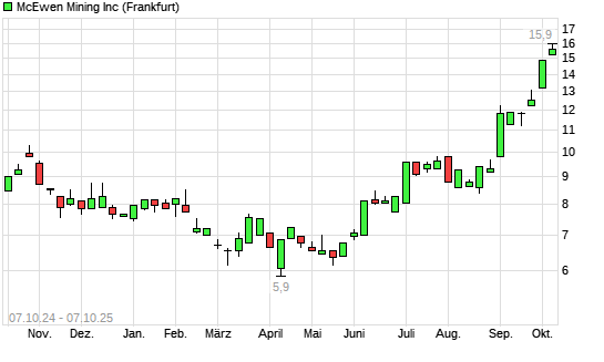 Mit dem Anstieg auf 15,90 EUR hat die McEwen Mining-Aktie (ISIN US58039P3055) am 06.10.2025 ein neues 5-Jahres-Hoch erreicht und damit den Kurs vom 03.10.2025 eingestellt.Die McEwen Mining-Aktie ...weiterlesen