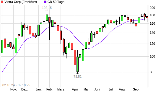 Mit dem Anstieg auf 172,75 EUR hat die Vistra Energy-Aktie am 01.10.2025 die 50-Tage-Linie nach oben gekreuzt.Die Vistra Energy-Aktie befindet sich seit dem 12.05.2025 im langfristigen Aufwärtstrend ...weiterlesen