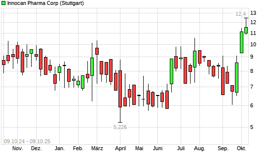 Mit dem Anstieg auf 12,20 EUR hat die INNOCAN PHARMA-Aktie (ISIN CA45783P5085) am 08.10.2025 ein neues 12-Monats-Hoch erreicht und damit den Kurs vom 07.10.2025 eingestellt.Die INNOCAN PHARMA-Aktie ...weiterlesen