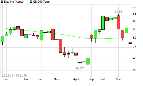 Mit dem Rücksetzer auf 46,61 EUR hat die Etsy-Aktie am 17.11.2025 die 200-Tage-Linie nach unten gekreuzt.Die Etsy-Aktie befand sich seit dem 11.09.2025 im langfristigen Aufwärtstrend und ...weiterlesen