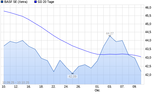 Mit dem Rücksetzer auf 42,99 EUR hat die BASF-Aktie am 09.10.2025 die 20-Tage-Linie nach unten gekreuzt.Die BASF-Aktie befindet sich seit dem 03.09.2025 im langfristigen Abwärtstrend und ...weiterlesen