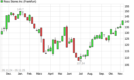 Mit dem Anstieg auf 138,72 EUR hat die Ross Stores-Aktie (ISIN US7782961038) am 04.11.2025 ein neues 6-Monats-Hoch erreicht und damit den Kurs vom 03.11.2025 eingestellt.Die Ross Stores-Aktie ...weiterlesen
