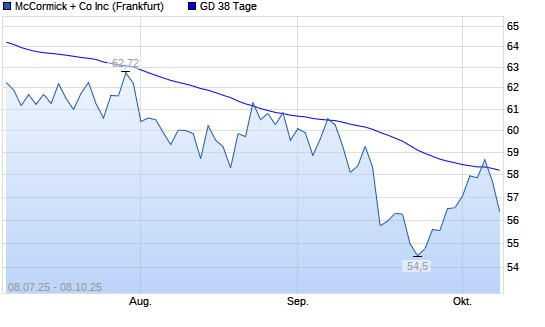 Mit dem Rücksetzer auf 57,72 EUR hat die McCormick-Aktie am 07.10.2025 die 38-Tage-Linie nach unten gekreuzt.Die McCormick-Aktie befindet sich seit dem 04.04.2025 im langfristigen Abwärtstrend ...weiterlesen