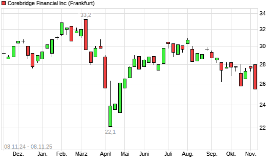 Mit dem Rücksetzer auf 25,50 EUR hat die Corebridge Financial-Aktie (ISIN US21871X1090) am 07.11.2025 ein neues 6-Monats-Tief erreicht und damit den Kurs vom 17.10.2025 eingestellt.Die ...weiterlesen
