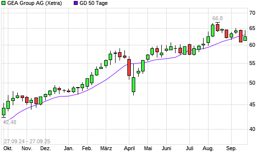 Mit dem Rücksetzer auf 62,35 EUR hat die GEA Group-Aktie am 26.09.2025 die 50-Tage-Linie nach unten gekreuzt.Die GEA Group-Aktie befindet sich seit dem 06.02.2024 im langfristigen Aufwärtstrend ...weiterlesen