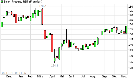 Mit dem Anstieg auf 160,00 EUR hat die Simon Property-Aktie (ISIN US8288061091) am 04.11.2025 ein neues 6-Monats-Hoch erreicht und damit den Kurs vom 01.10.2025 eingestellt.Die Simon Property-Aktie ...weiterlesen