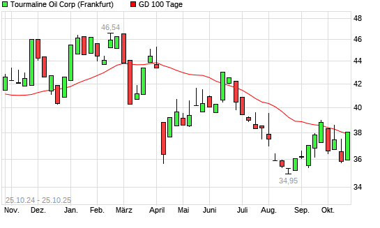 Mit dem Anstieg auf 38,06 EUR hat die Tourmaline Oil-Aktie am 24.10.2025 die 100-Tage-Linie nach oben gekreuzt.Die Tourmaline Oil-Aktie befindet sich seit dem 23.06.2025 im langfristigen Abwärtstrend ...weiterlesen