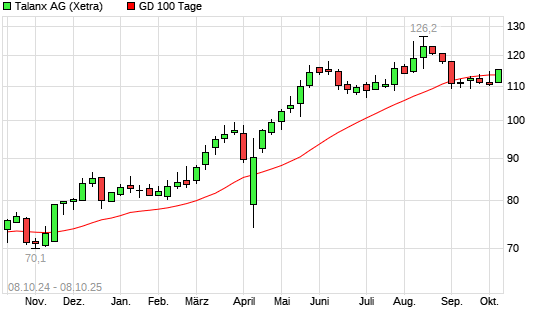 Mit dem Anstieg auf 114,80 EUR hat die Talanx-Aktie am 07.10.2025 die 100-Tage-Linie nach oben gekreuzt.Die Talanx-Aktie befindet sich seit dem 06.11.2024 im langfristigen Aufwärtstrend und ...weiterlesen