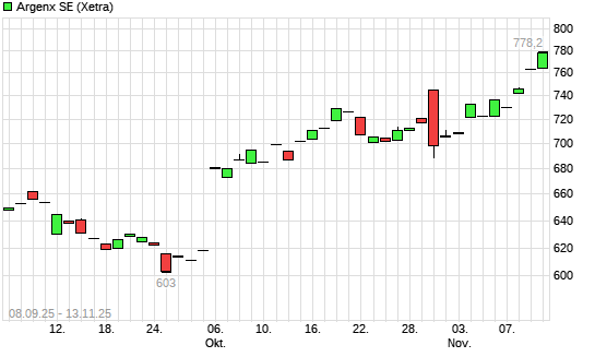 Mit dem Anstieg auf 773,80 EUR hat die Argenx-Aktie (ISIN NL0010832176) am 12.11.2025 ein neues All-Time-High erreicht und damit den Kurs vom 11.11.2025 eingestellt.Die Argenx-Aktie befindet ...weiterlesen
