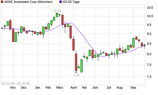 Mit dem Anstieg auf 8,41 EUR hat die AGNC INV.-Aktie am 01.10.2025 die 50-Tage-Linie nach oben gekreuzt.Die AGNC INV.-Aktie befindet sich seit dem 18.09.2025 im langfristigen Abwärtstrend und ...weiterlesen