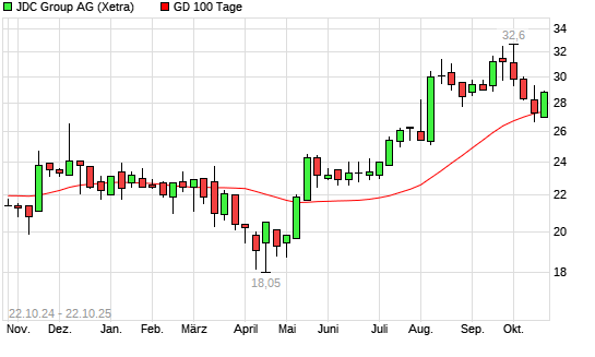 Mit dem Anstieg auf 27,90 EUR hat die JDC Group-Aktie am 21.10.2025 die 100-Tage-Linie nach oben gekreuzt.Die JDC Group-Aktie befindet sich seit dem 12.05.2025 im langfristigen Aufwärtstrend ...weiterlesen