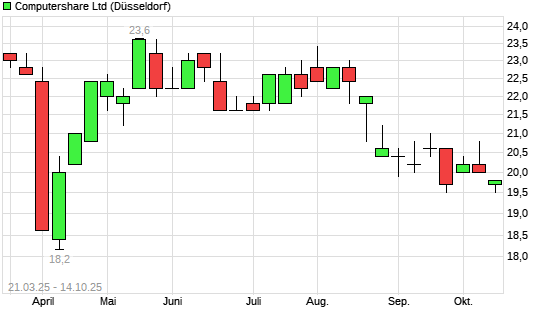 Mit dem Rücksetzer auf 19,60 EUR hat die Computershare-Aktie (ISIN AU000000CPU5) am 13.10.2025 ein neues 6-Monats-Tief erreicht und damit den Kurs vom 26.09.2025 eingestellt.Die Computershare-Aktie ...weiterlesen