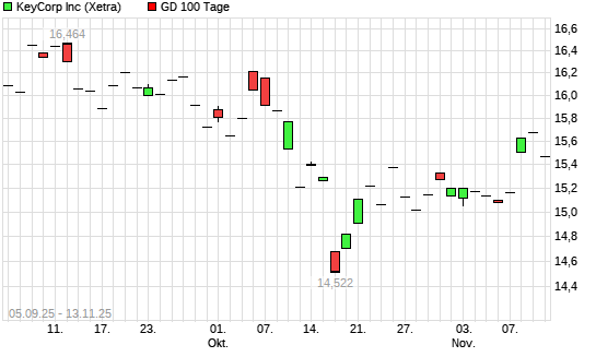 Mit dem Rücksetzer auf 15,48 EUR hat die KeyCorp-Aktie am 12.11.2025 die 100-Tage-Linie nach unten gekreuzt.Die KeyCorp-Aktie befindet sich seit dem 31.10.2025 im langfristigen Aufwärtstrend ...weiterlesen