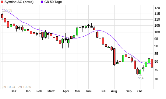Mit dem Rücksetzer auf 77,48 EUR hat die Symrise-Aktie am 28.10.2025 die 50-Tage-Linie nach unten gekreuzt.Die Symrise-Aktie befindet sich seit dem 09.06.2025 im langfristigen Abwärtstrend ...weiterlesen