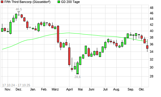 Mit dem Rücksetzer auf 36,51 EUR hat die Fifth Third Bancorp-Aktie am 16.10.2025 die 200-Tage-Linie nach unten gekreuzt.Die Fifth Third Bancorp-Aktie befand sich seit dem 15.10.2025 im ...weiterlesen